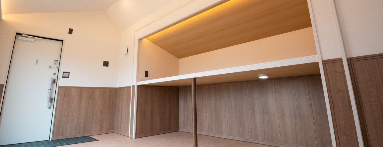 小型犬はもちろん、大型の犬種でも余裕を持って宿泊できる広々空間を実現しました。また、高品質断熱材フェノバボードを使用しているため、寒さや暑さに敏感なワンちゃんも快適に過ごせます。
