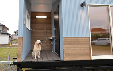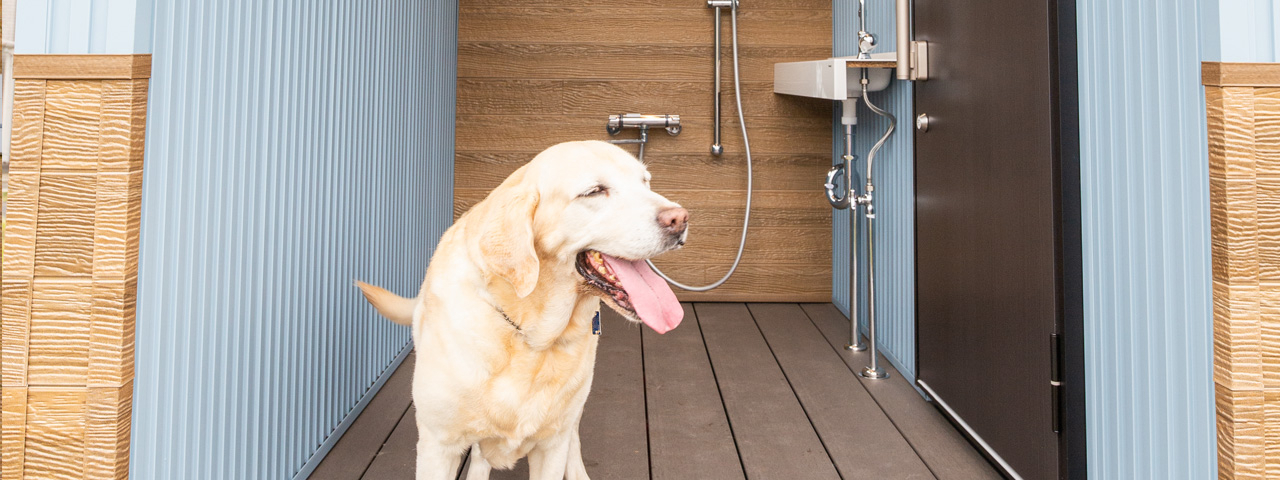入り口の手前に、天候に左右されない屋根付きのウッドデッキを設け、足洗い場やグルーミングスペースを設置しました。