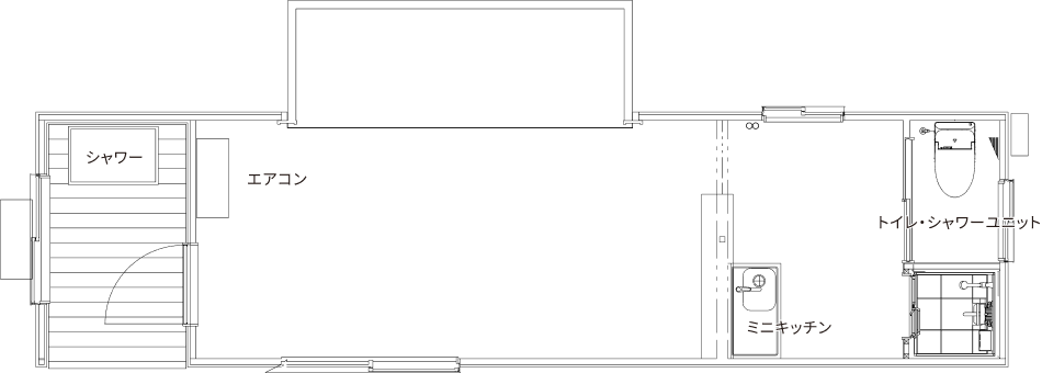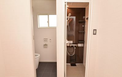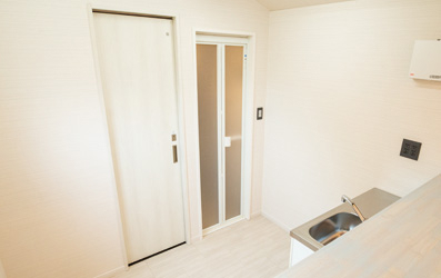人の生活空間であるシャワーやトイレ、ミニキッチンには、ワンちゃんが入らないように