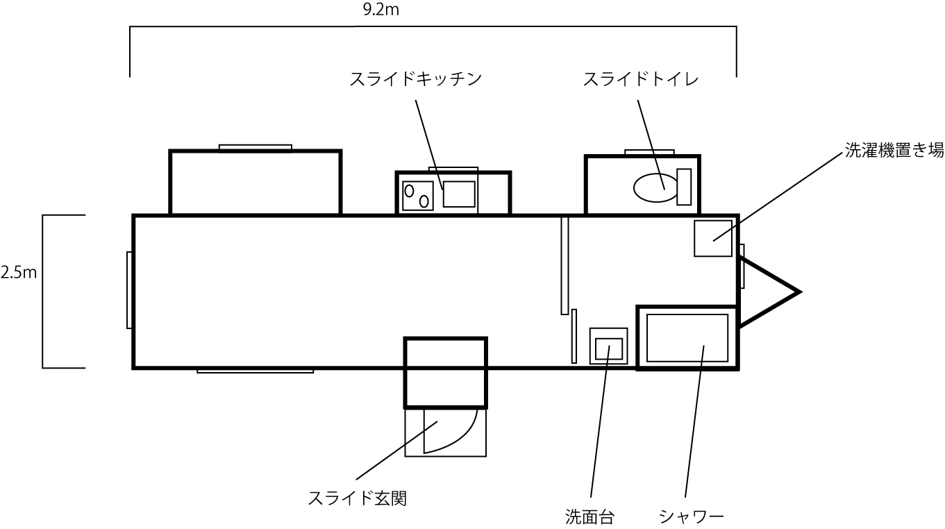 | 装 備 | シャワー(1200*800サイズ)・スライドトイレ(温水洗浄便座付)・ スライドキッチン(IH・2口)・スライド玄関・各部照明・照明レール式・各コンセント・スライドアウト・タイルカーペット・リジェーロα(エントランスドア) |