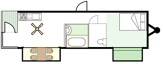 お風呂・キッチン・トレイなど住居に必要な装備を搭載したトレーラーハウスです。ご住居・別荘・宿泊施設等に最適な日本製トレーラーハウス! デッキ部分に玄関を設けることにより、カレント1100Dよりもさらにお部屋を広くお使いいただけるプランとなっております。